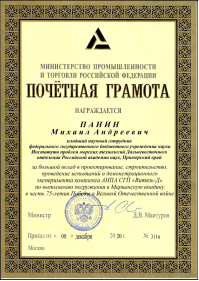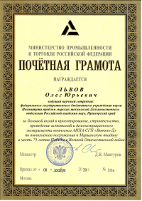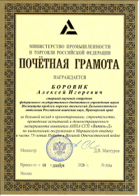 За большой вклад в проектирование, строительство, проведение испытаний и демонстрационного эксперимента комплекса АНПА СГП «Витязь-Д» по выполнению погружения в Марианскую впадину в честь 75-летия Победы в Великой Отечественной войне сотрудники ИПМТ ДВО РАН О.Ю. Львов, А.И. Боровик и М.А. Панин награждены Почетной грамотой Министерства промышленности и торговли Российской Федерации.