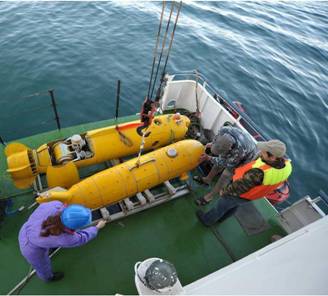 Рис.2. Демонстрация АНПА "ММТ-3000" и автономно-привязного аппарата "TSL" на борту НИС "Юрий Молоков" |